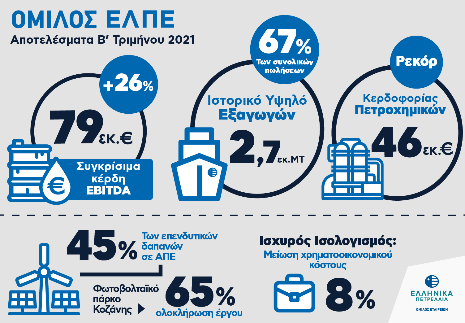 Τα ΕΛΠΕ ανακοίνωσαν χθες ιστορικό ρεκόρ εξαγωγών στο 2ο τρίμηνο του έτους, με το 67% των προϊόντων πετρελαιοειδών να κατευθύνεται σε αγορές του εξωτερικού. Τα συγκρίσιμα λειτουργικά κέρδη τριμήνου αυξήθηκαν κατά 26% στα 79 εκατ. και τα καθαρά κέρδη στα 10 εκατ.