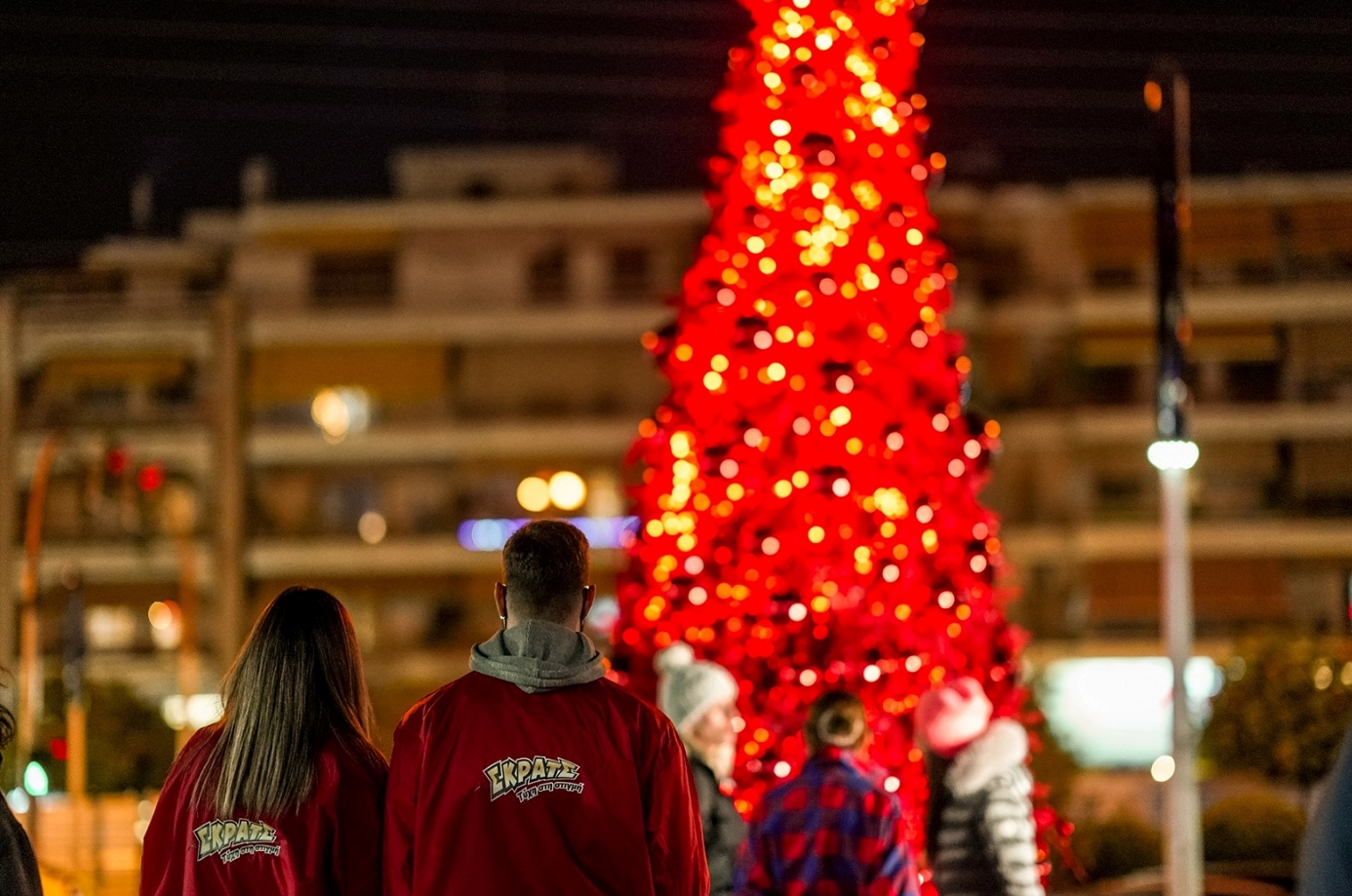 Το κατακόκκινο δέντρο του ΣΚΡΑΤΣ δημιουργεί ένα άκρως εορταστικό κλίμα στην πλατεία Μανδηλαρά, στο Γαλάτσι, και γεμίζει με χριστουγεννιάτικο χρώμα τις φωτογραφίες κατοίκων και επισκεπτών.
