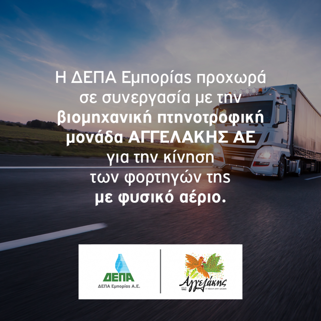 Η ΔΕΠΑ Εμπορίας, η οποία μέσω του Fisikon επενδύει στη μετάβαση προς «καθαρότερες» μετακινήσεις, προχωρά σε συνεργασία με την ΑΓΓΕΛΑΚΗΣ ΑΕ, μια σύγχρονη, καθετοποιημένη βιομηχανική πτηνοτροφική μονάδα, με 60 χρόνια παρουσίας στην ελληνική αγορά. Στο πλαίσιο της συνεργασίας με τη ΔΕΠΑ Εμπορίας, η ΑΓΓΕΛΑΚΗΣ ΑΕ θα προχωρήσει σε σταδιακή αντικατάσταση όλων των φορτηγών της, όπου αυτό είναι εφικτό, με οχήματα που κινούνται με φυσικό αέριο, με στόχο τον περιορισμό των αρνητικών επιπτώσεων των δραστηριοτήτων της στο περιβάλλον.