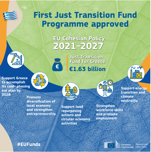 Οι ευρωπαϊκοί πόροι θα αξιοποιηθούν για τον μετασχηματισμό των τοπικών οικονομιών, ώστε να στραφούν μακριά από τη λιγνιτοπαραγωγή και προς τη χρήση πράσινων πηγών, για τη δημιουργία νέων θέσεων εργασίας, την επαναξιοποίηση γης που σήμερα χρησιμοποιείται για την παραγωγή λιγνίτη, την ανάπτυξη ενεργειακών κοινοτήτων για την τοπική παραγωγή ενέργειας, την ηλεκτροκίνηση και την αποθήκευση ενέργειας.