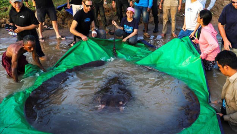 Χωρικοί στον ποταμό Μεκόνγκ στην Καμπότζη έπιασαν το μεγαλύτερο, σύμφωνα με τους επιστήμονες, ψάρι του γλυκού νερού που έχει καταγραφεί ποτέ, ένα σελάχι που ζύγιζε 300 κιλά και χρειάστηκαν δώδεκα άνδρες για να βγάλουν στην ακτή.