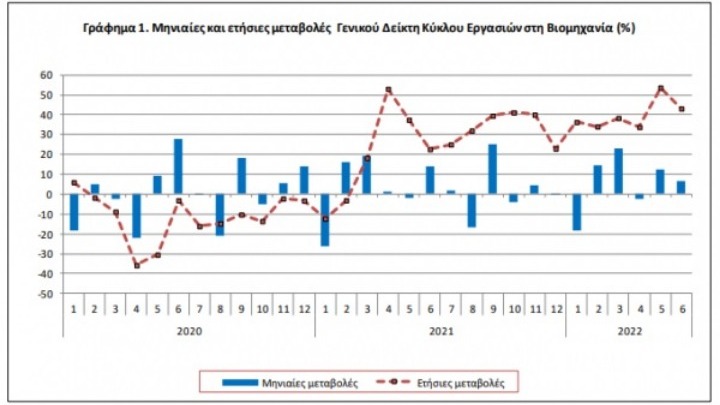 Αύξηση 43,1% σημείωσε ο γενικός δείκτης κύκλου εργασιών στη βιομηχανία (σύνολο εγχώριας και εξωτερικής αγοράς) τον Ιούλιο εφέτος σε σύγκριση με τον αντίστοιχο δείκτη του Ιουνίου 2021, έναντι αύξησης 22,7% που σημειώθηκε κατά την αντίστοιχη σύγκριση το 2021 με το 2020.