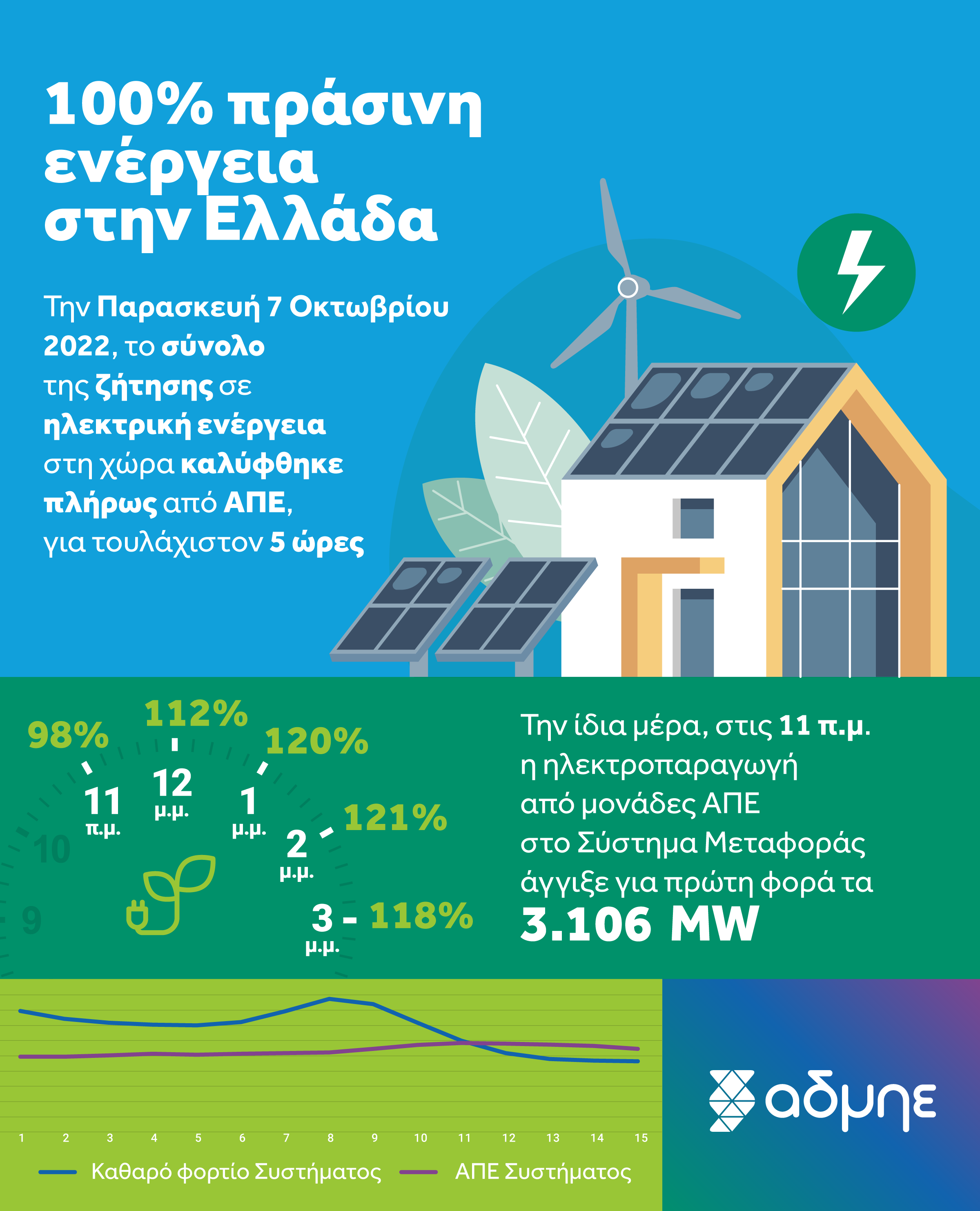 Για πρώτη φορά στην ιστορία του ελληνικού ηλεκτρικού συστήματος, την περασμένη Παρασκευή 7 Οκτωβρίου από τις 11 το πρωί ως τις 4 το μεσημέρι η ζήτηση καλύφθηκε κατά 100% από ανανεώσιμες πηγές ενέργειας.