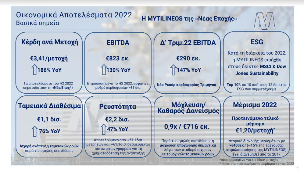 Η επίδοση του δεύτερου εξαμήνου (H2) του 2022, παγιώνει ένα νέο επίπεδο κερδοφορίας, το οποίο για τα επόμενα έτη αναμένεται να ενισχυθεί περαιτέρω από τη συνεισφορά της νέας μονάδας παραγωγής ενέργειας, τις υψηλότερες τιμές αλουμινίου, καθώς και από την ενίσχυση της κερδοφορίας στους τομείς των ΑΠΕ και νέων ενεργειακών έργων, αλλά κυρίως από τη συνεχώς διευρυμένη δραστηριοποίηση της MYTILINEOS στις παγκόσμιες αγορές.