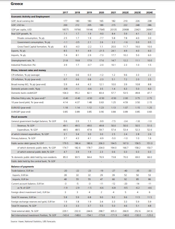 Ισχυρή ανάπτυξη και το 2023 αναμένει για την ελληνική οικονομία η UBS, σύμφωνα με την ανανεωμένη έκθεσή της για την Ελλάδα. Για το 2022 η UBS αναθεωρεί την πρόβλεψή της επί τα χείρω, καθώς «βλέπει» ανάπτυξη 5,9% έναντι προηγούμενης πρόβλεψης για 6,4%. Για το 2023 προβλέπει ανάπτυξη 3,2% από 2,5%, ενώ για το 2024 η πρόβλεψη είναι στο 3,2%.