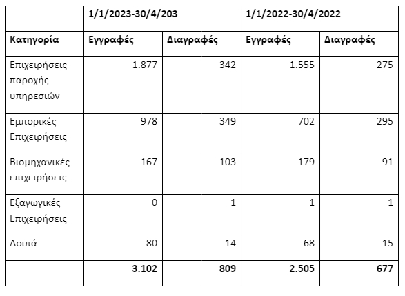 “Παρά τις προκλήσεις που εξακολουθούν να υπάρχουν στην διεθνή οικονομία, η επιχειρηματικότητα στην Ελλάδα διατηρεί και ενισχύει τη δυναμική της, με τον αριθμό επιχειρήσεων που εγγράφηκαν για πρώτη φορά στο ΓΕΜΗ κατά τους τέσσερις πρώτους μήνες του 2023 να είναι σχεδόν τέσσερις φορές υψηλότερος σε σχέση με τον αριθμό των επιχειρήσεων που διαγράφηκαν”.