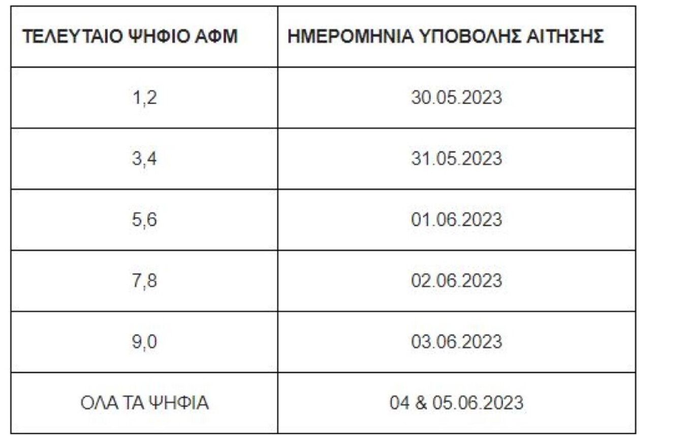 Η πλατφόρμα θα ανοίγει σταδιακά ανάλογα με το τελευταίο ψηφίο του ΑΦΜ των ενδιαφερόμενων δικαιούχων έως τις 05.06.2023 και ώρα 23:59, οπότε θα παραμείνει ανοικτή για όλα τα ψηφία ΑΦΜ, ως εξής: