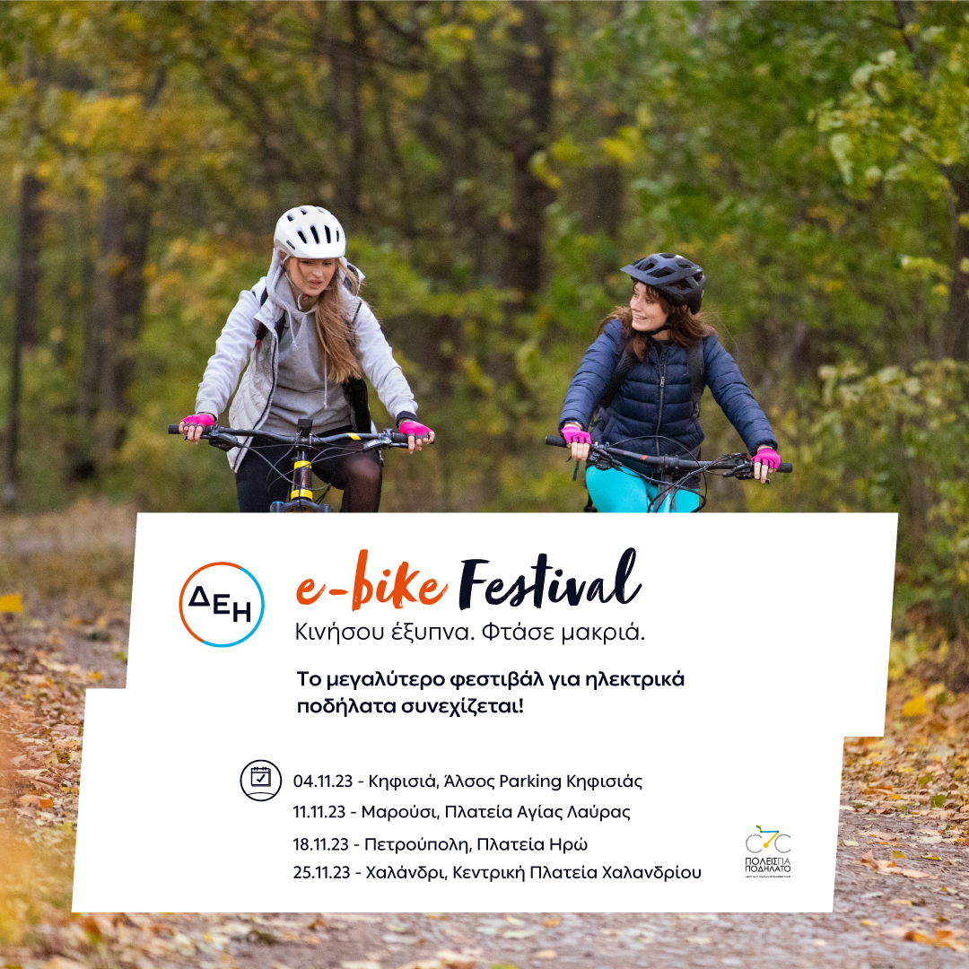 Να γνωρίσουν από κοντά και να ανακαλύψουν τις ευκολίες και τις δυνατότητες που προσφέρουν τα ηλεκτρικά ποδήλατα, καλεί η ΔΕΗ τους κατοίκους και επισκέπτες της Αθήνας. Το ΔΕΗ e-bike Festival, που συνεχίζεται για 3η χρονιά, πραγματοποιείται σε 4 περιοχές της Αθήνας μέσα στο Νοέμβριο και συγκεκριμένα: