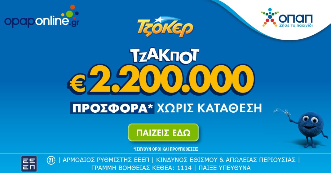 Την ευκαιρία να καταθέτουν τα δελτία τους διαδικτυακά, με λίγα κλικ, έχουν, μέσω του opaponline.gr και του Opaponline App, όλοι όσοι θέλουν να συμμετάσχουν στην αποψινή κλήρωση του ΤΖΟΚΕΡ για τα 2,2 εκατομμύρια ευρώ. Μάλιστα, για όλους τους διαδικτυακούς παίκτες υπάρχει διαθέσιμη προσφορά* χωρίς κατάθεση για όλα τα παιχνίδια αριθμών του ΟΠΑΠ (ΤΖΟΚΕΡ, ΚΙΝΟ, ΛΟΤΤΟ, ΠΡΟΤΟ, SUPER 3) τόσο στο opaponline.gr όσο και στο Opaponline App. Για την προσφορά ισχύουν όροι και προϋποθέσεις.