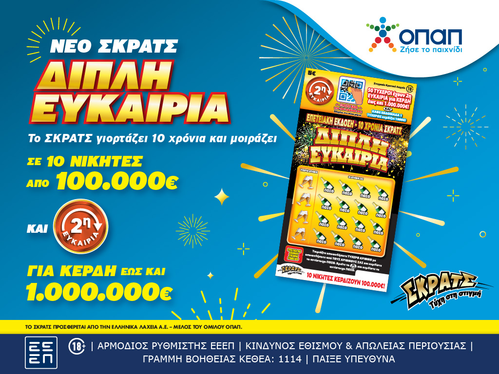 Το ΣΚΡΑΤΣ γίνεται 10 ετών και το γιορτάζει με το επετειακό παιχνίδι «Διπλή Ευκαιρία», που μοιράζει 100.000 ευρώ σε 10 νικητές, ενώ για πρώτη φορά δίνει την ευκαιρία στους παίκτες να διεκδικήσουν έως και 1.000.000 ευρώ, ακόμα και αν ο λαχνός τους δεν κερδίσει.