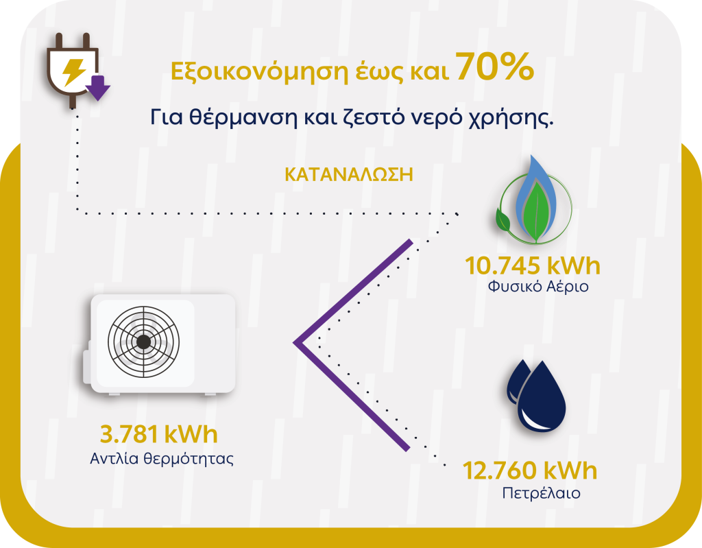 Πιο συγκεκριμένα, η θέρμανση και το ζεστό νερό χρήσης σε έναν χώρο, είναι δύο στοιχεία που επηρεάζουν αρκετά την κατανάλωση ηλεκτρικής ενέργειας και συνεπώς τα έξοδα, καθώς και την εκπομπή ρύπων. Ένα από τα δημοφιλέστερα και αποδοτικότερα συστήματα για θέρμανση και ψύξη του σπιτιού αλλά και ζεστό νερό είναι οι αντλίες θερμότητας, που βασίζονται στη μεταφορά ενέργειας από έναν χώρο χαμηλής θερμοκρασίας σε έναν χώρο υψηλότερης. Συγκρινόμενες με τα συμβατικά συστήματα όπως π.χ. οι καυστήρες πετρελαίου αποδεικνύονται μακράν η πιο βιώσιμη λύση, αφού ένα μέσο νοικοκυριό εγκαθιστώντας την κατάλληλη αντλία θερμότητας, μπορεί να επιτύχει έως 70% εξοικονόμηση ενέργειας, ανάλογα πάντα με το μέγεθος του σπιτιού, τις ανάγκες των πελατών, καθώς και το υφιστάμενο σύστημα θέρμανσης. Η ΔΕΗ μάλιστα ενθαρρύνει τη συγκεκριμένη αγορά, προσφέροντας έως 500€ στους πελάτες για αγορά αντλίας θερμότητας μέσω της ειδικής εφαρμογής, που έχει δημιουργήσει.
