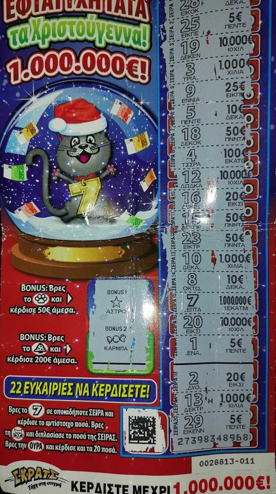 Το κόστος του τυχερού λαχνού ΣΚΡΑΤΣ, που έκανε εκατομμυριούχο τον μεγάλο νικητή, ήταν 10 ευρώ. Όπως αναφέρει ο κος Παπαχριστοφίλου, «ο τυχερός παίκτης σκράτσαρε μία-μία τις περιοχές και βρήκε τον αριθμό 7. Όταν εμφανίστηκε το ποσό του 1 εκατ. ευρώ ακριβώς δίπλα πάγωσε. Μου έδωσε τον λαχνό και μου είπε να το τσεκάρω. Σκάναρα το QR code του τυχερού ΣΚΡΑΤΣ στο OPAP Store App στο κινητό μου και όταν είδαμε το ποσό του κέρδους στην οθόνη, ξεκίνησαν τα… πανηγύρια μέσα στο μαγαζί».
