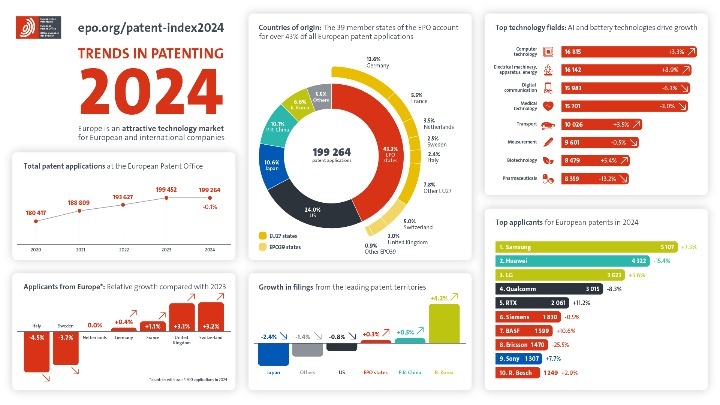 Η Samsung αναδείχθηκε ως ο νέος κορυφαίος αιτών στο EPO το 2024 (έχοντας καταλάβει την πρώτη θέση τελευταία φορά το 2020), η Huawei έπεσε στη δεύτερη θέση, ακολουθούμενη από τις LG, Qualcomm και RTX. Μεταξύ των 10 κορυφαίων αιτούντων περιλαμβάνονται τέσσερις εταιρείες από την Ευρώπη, δύο από τη Νότια Κορέα, δύο από τις ΗΠΑ και μία από την Κίνα και την Ιαπωνία.