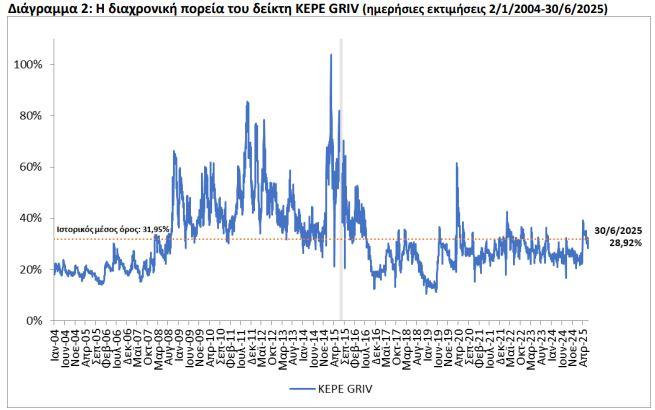 Ο δείκτης KEPE GRIV υποχώρησε στο 28,92% στις 30/6/2025 (από 32,80% στις 30/5).