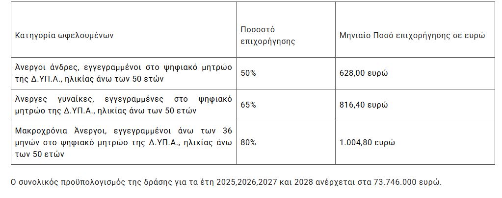 Το ποσό επιχορήγησης του κάθε ωφελούμενου σε μηνιαία βάση ανάλογα με την κατηγορία του ανέργου, ως εξής: