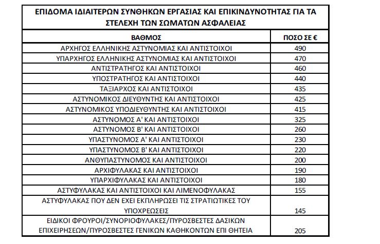 Ειδικότερα το επίδομα ιδιαίτερων συνθηκών εργασίας και επικινδυνότητας, λόγω της ιδιαίτερης φύσης των καθηκόντων των στελεχών των Σωμάτων Ασφαλείας και της επικινδυνότητας που απορρέει από την άσκησή τους, καθώς και της απασχόλησης χωρίς ωράριο εργασίας ή πέραν του ωραρίου εργασίας, οριζόμενο κατά βαθμό ως εξής: