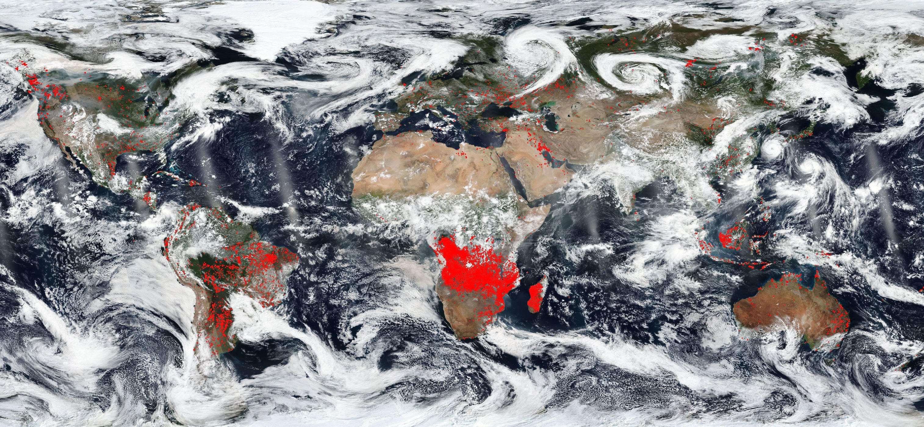 «Φαίνεται πως η Αφρική έχει συγκεντρώσει τις περισσότερες φωτιές», δηλώνουν επιστήμονες της NASA. «Αυτό ίσως οφείλεται στο ότι οι περισσότερες είναι σε γεωργικές εκτάσεις. Οι αγρότες ανάβουν φωτιές για να καθαρίσουν το έδαφος από τα διάφορα παράσιτα αλλά και για να επιστρέψουν σε αυτό τα απαραίτητα θρεπτικά συστατικά.»