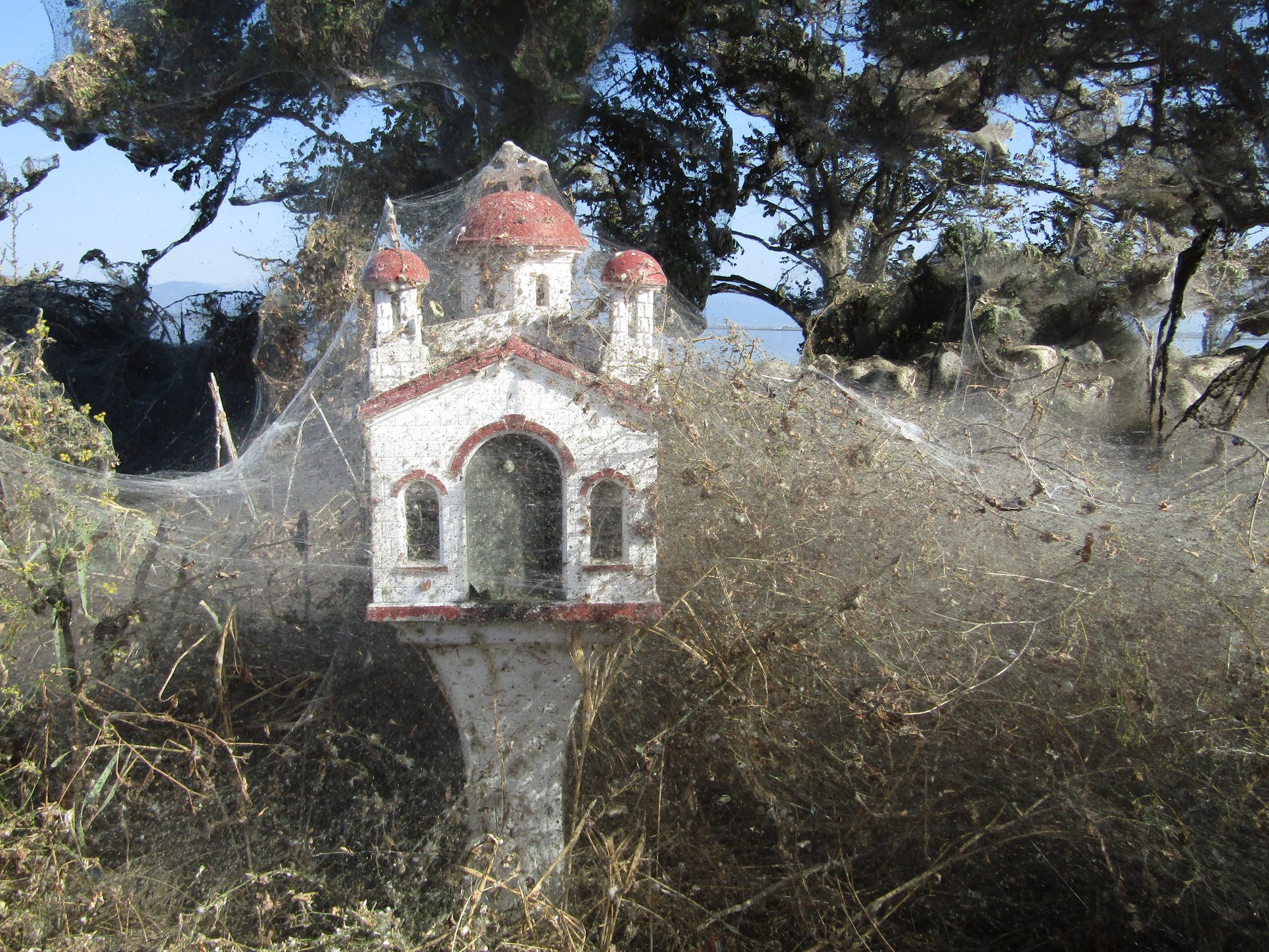 Σκηνές από ταινία τρόμου αντικρίζουν αυτές τις ημέρες οι επισκέπτες της Λίμνης Βιστωνίδας, ενός από τους σημαντικότερους υδροβιότοπους της βόρειας Ελλάδας. Χιλιόμετρα ιστών αράχνης καλύπτουν τα πάντα, θάμνους, δέντρα, ξερόκλαδα, φράχτες, ακόμα και ξωκλήσια, στην παρόχθια ζώνη της λίμνης που πλήττεται από το ίδιο φαινόμενο το οποίο παρατηρήθηκε πριν από λίγο καιρό στο Αιτωλικό.