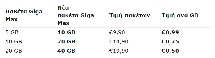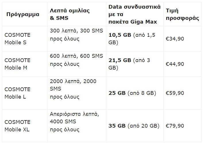 Αναλυτικά, τα νέα διαθέσιμα πακέτα Giga Max για όλους τους συνδρομητές συμβολαίου και καρτοσυμβολαίου COSMOTE: