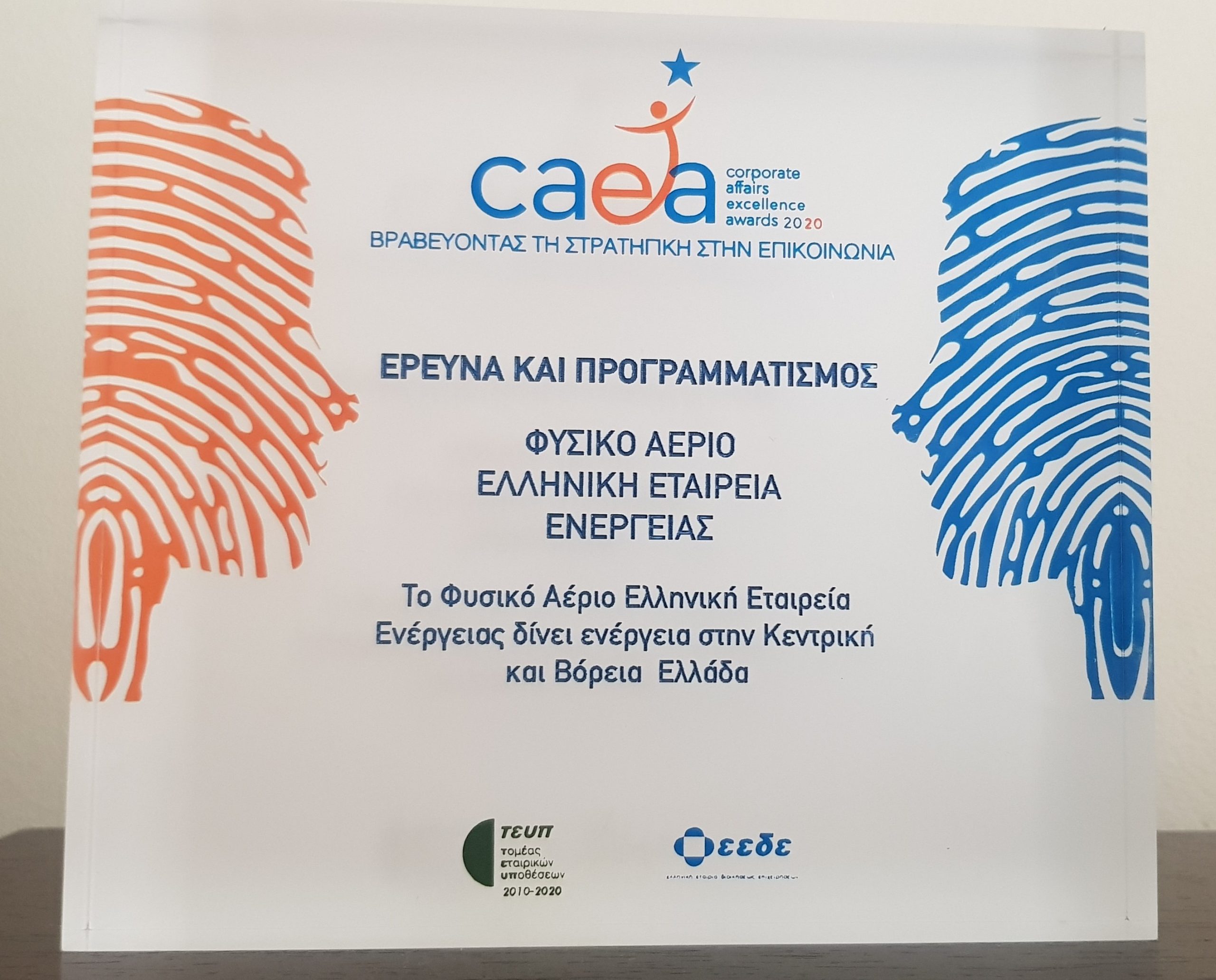 Ειδική διάκριση απέσπασε το Φυσικό Αέριο Ελληνική Εταιρεία Ενέργειας στην κατηγορία «Έρευνα και Προγραμματισμός», στο πλαίσιο των Corporate Affairs Excellence Awards που διοργάνωσε ο Τομέας Εταιρικών Υποθέσεων της Ελληνικής Εταιρείας Διοίκησης Επιχειρήσεων.